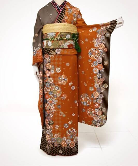 赤茶色と朽葉色(くちばいろ)のシックな配色に黒の差し色が入った大人っぽく落ち着いた雰囲気の振袖。小桜、菊、梅、竹など四季折々の花と、胸元や裾には矢羽根網代(やばねあじろ)という古くからの編み模様が描かれていてクラシカルで豪華✿