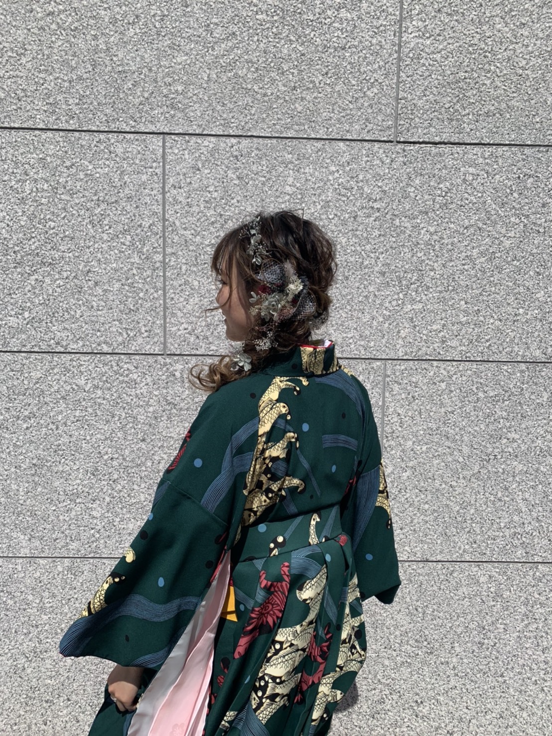 緑地のお着物、濃いピンクの袴とどこをとっても個性的です。