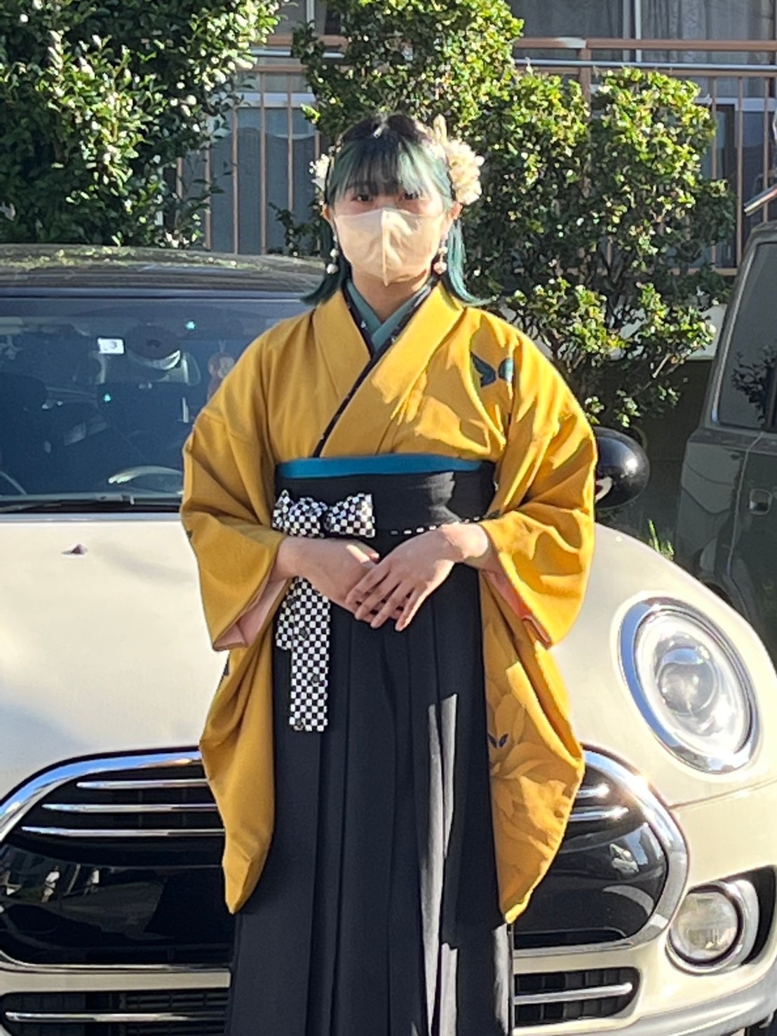 お召しいただいたのはシンプルなのに個性的なからし色の着物をコーディネートした卒業袴。