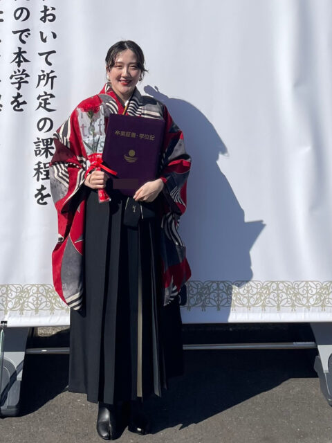 とても素敵な笑顔のお写真が届きました。 ご卒業おめでとうございます! 鮮烈な「赤」と「黒」の配色がスタイリッシュな袴姿をご紹介。 グラフィカルな振袖を黒の袴とブーツで引き締めた、都会的なコーディネートが秀逸です。 手にされた赤のカーネーションとリンクしたスタイリングで、凛とした美しさが際立っています。