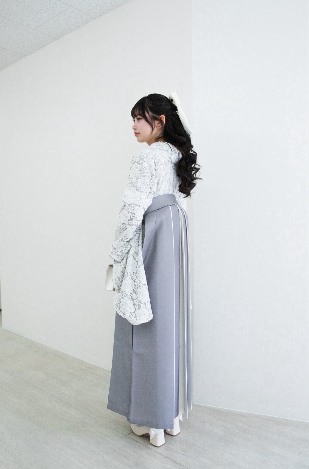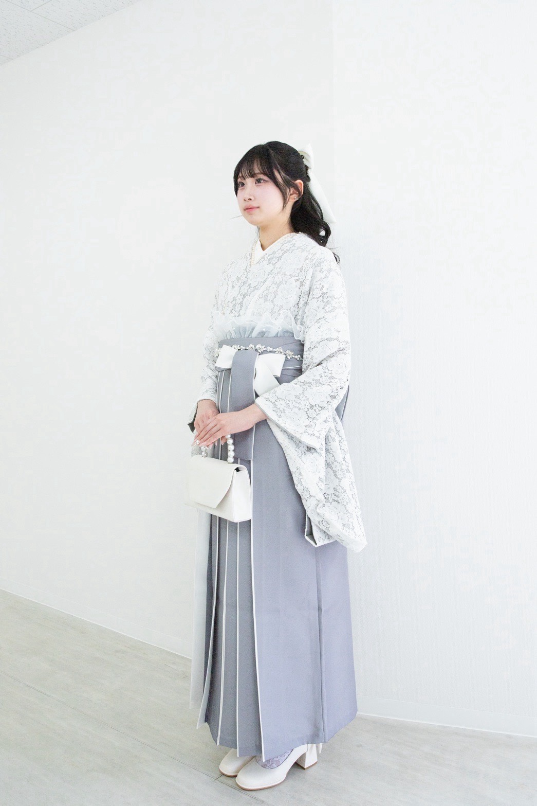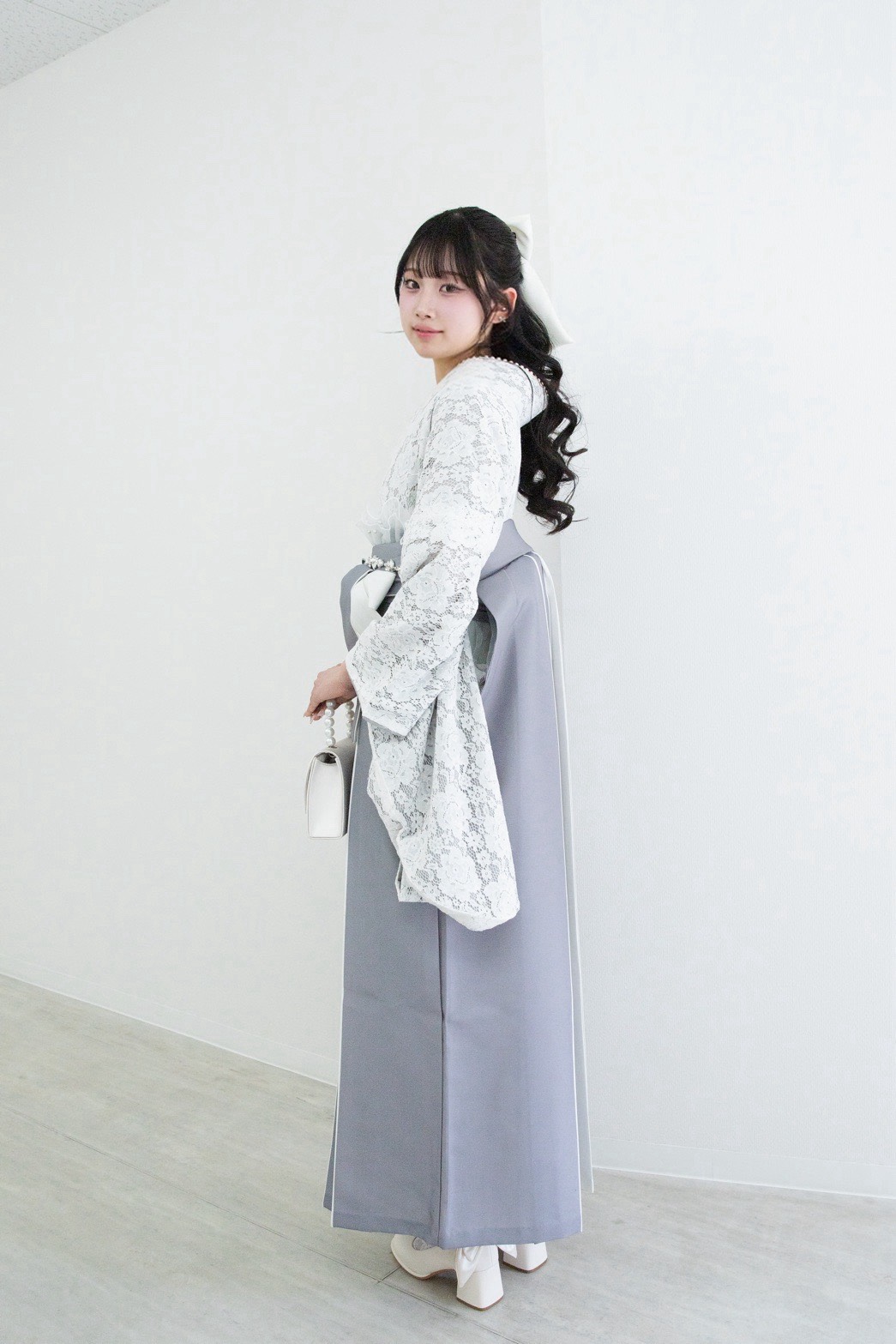 繊細な白のレース振袖に、柔らかなグレーの袴を合わせた、まるでアイドルのようなスナップをいただきました。ヘアリボン、パールのバッグ、足元のフリルまで、すべての小物を「白」で統一したこだわりのスタイリング。甘く儚げな雰囲気でお客様の可愛らしさが最大限に引き出された、完璧なコーディネートです。