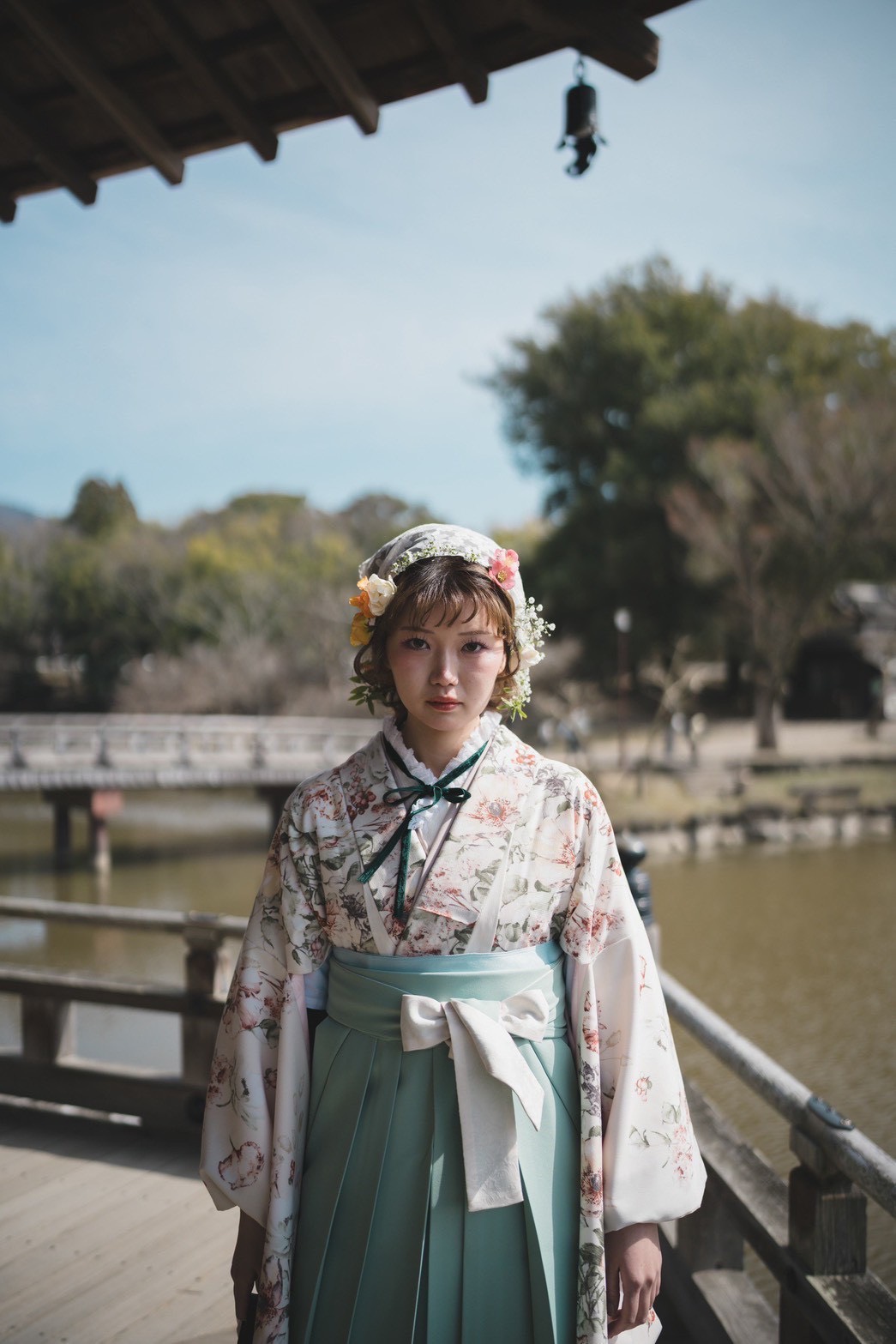 シカさんと微笑む、ハレの日の喜びが伝わってくるスナップです。アイボリー地の愛らしい草花柄振袖は、お客様の明るい雰囲気にぴったり。「会った人みんなから褒めていただけました」とのお言葉通り、周囲を魅了する素晴らしいコーディネートで、一生の思い出に残る素晴らしい門出の装いですね。