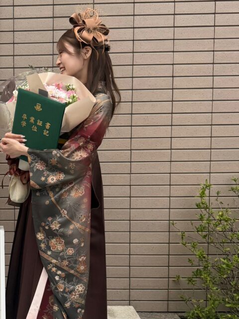 ご卒業おめでとうございます!深みのあるニュアンスカラーを基調に、アンティーク調の草花柄が浮かび上がる、洗練された都会的な印象を与えます。「一生忘れない」というお客様のコメントも納得の、完璧なスタイリングでした。伝統とトレンディさを両立させた、忘れられない一枚です。