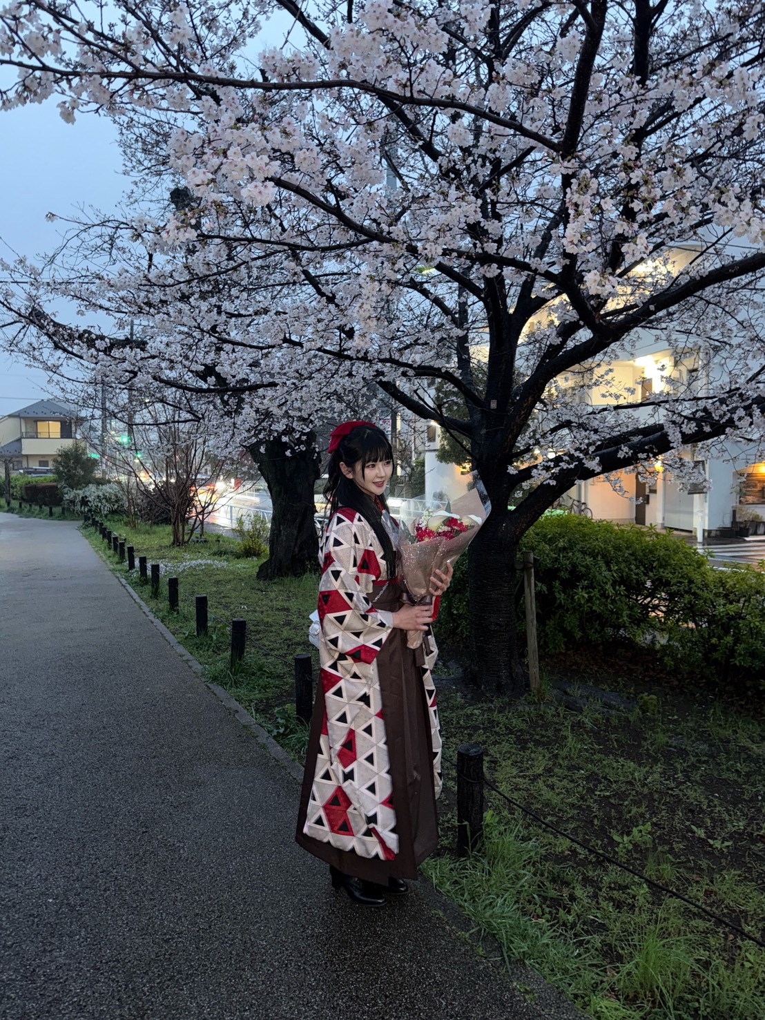 夜桜の下で微笑む、ハレの日の喜びが伝わってくるスナップです。幾何学的な「とらいあんぐるまじっく」の振袖は、お客様の明るい雰囲気にぴったり。「個性のある袴」とのお言葉通り、周囲を魅了する素晴らしいコーディネートで、新しい門出を飾る一枚となりました。芸術大学に通われるお客様ならではの感性が光る、唯一無二のコーディネートです。