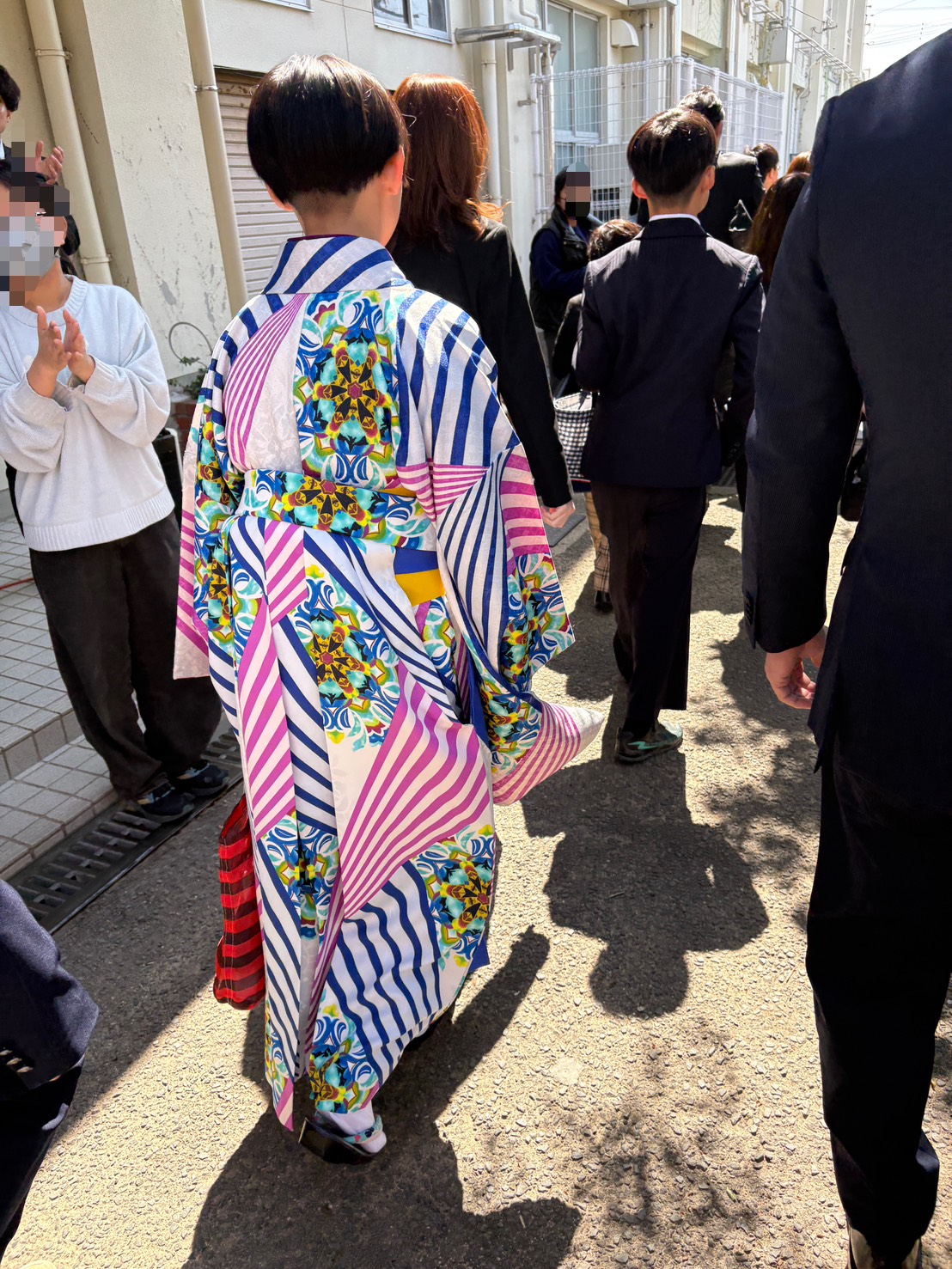 幾何学的な「万華鏡柄」と「ストライプ」が融合した、アートのような振袖姿をご紹介。鮮やかな配色と大胆なデザインが、都会的で洗練された印象を与えます。「かわいくて、何度も声をかけられました」というコメントも納得の、圧倒的な存在感を放つ完璧なスタイリングでした。