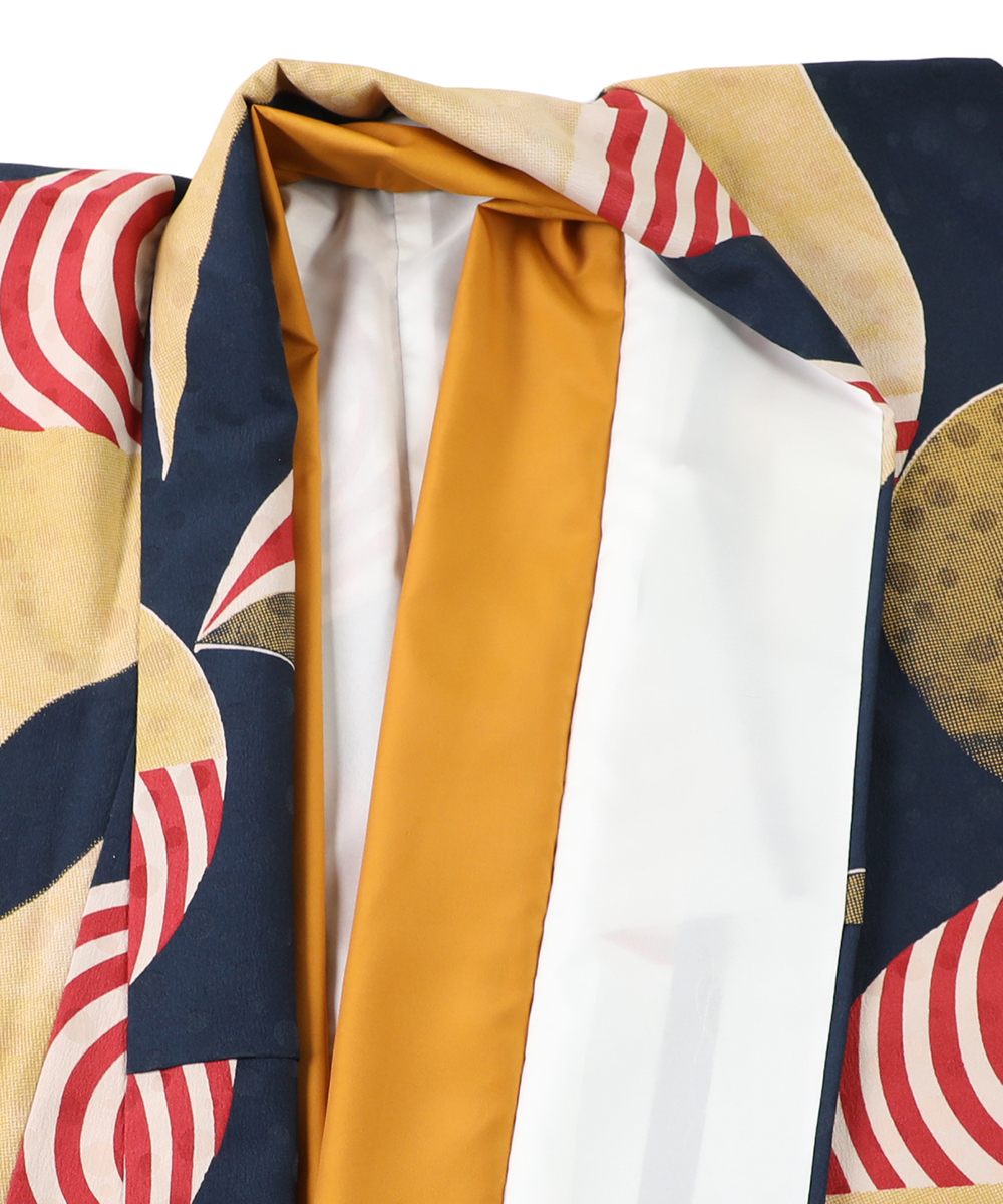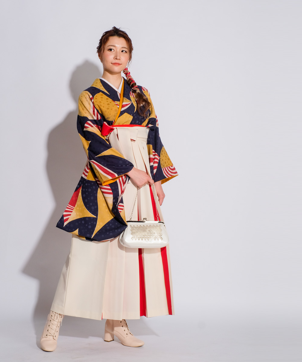 「浮遊」というテーマでデザインされたモダンアンテナのレトロな着物。ポップな幾何学模様がモダンでお洒落。生成りと赤の切り返し袴もモダンアンテナのオリジナル袴です。十分インパクトのある袴スタイルなので、半襟は白ですっきりと、重ね襟や半幅帯は着物の柄のお色を合わせて、まとまりある上品な印象に。