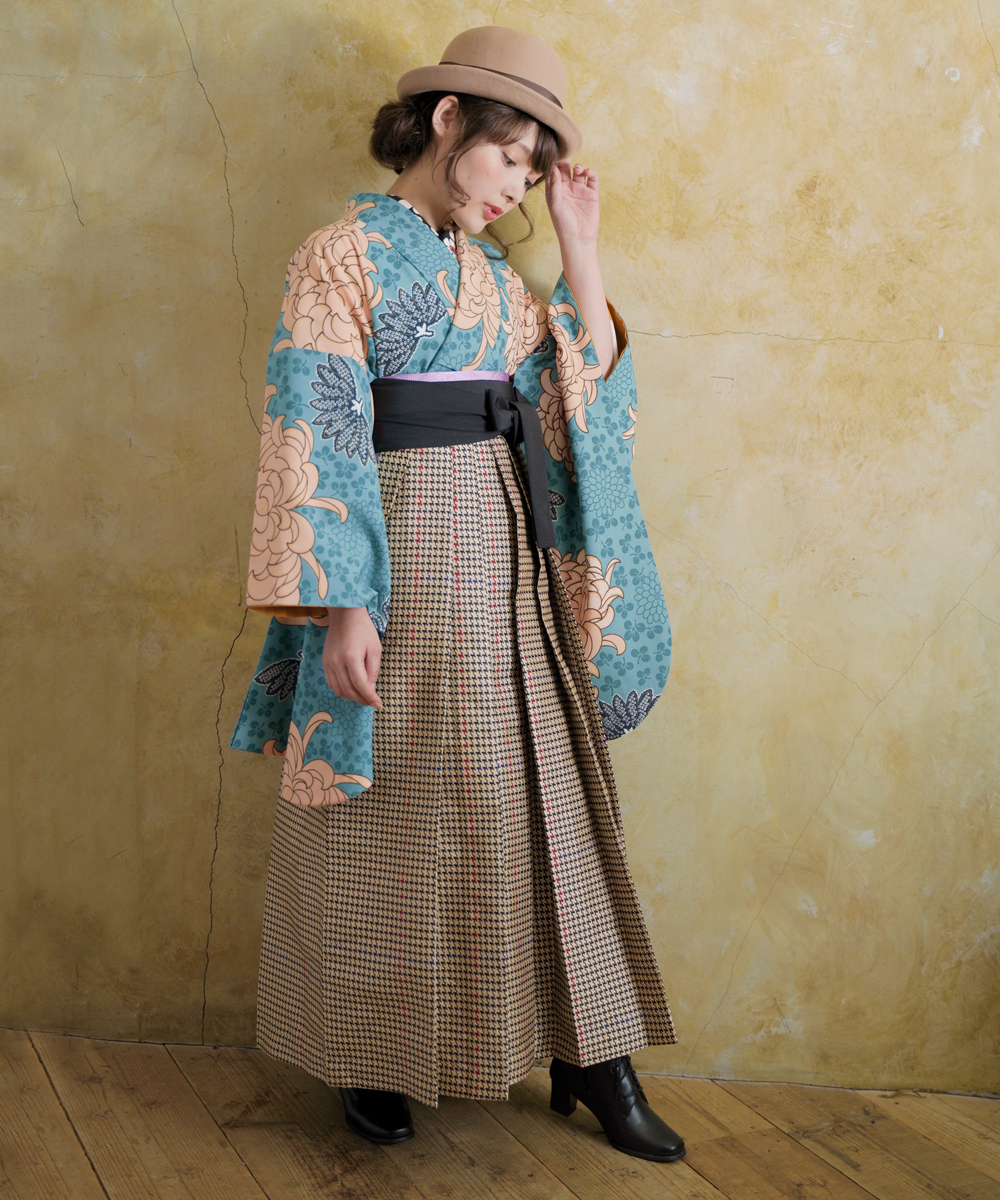 「ちょっとレトロ、そしてモダンで可愛い」がテーマのブランド【ラフィネモカ】の袴スタイル。印象的に咲いた大輪の菊の花の着物と千鳥格子の袴がノスタルジックな存在感。優しい色使いが楚々として女性らしさ溢れる華やかさを演出。