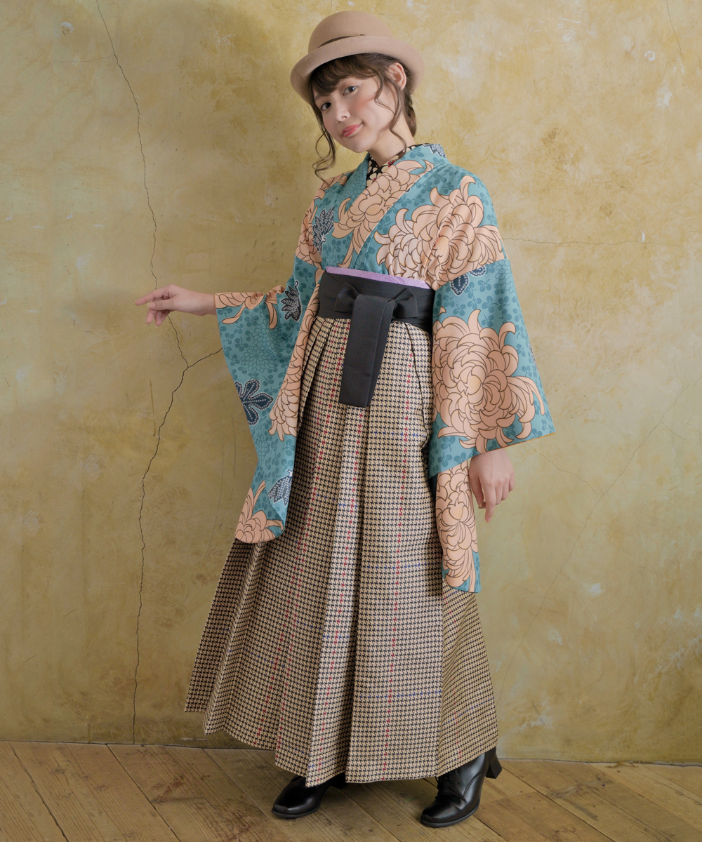 「ちょっとレトロ、そしてモダンで可愛い」がテーマのブランド【ラフィネモカ】の袴スタイル。印象的に咲いた大輪の菊の花の着物と千鳥格子の袴がノスタルジックな存在感。優しい色使いが楚々として女性らしさ溢れる華やかさを演出。
