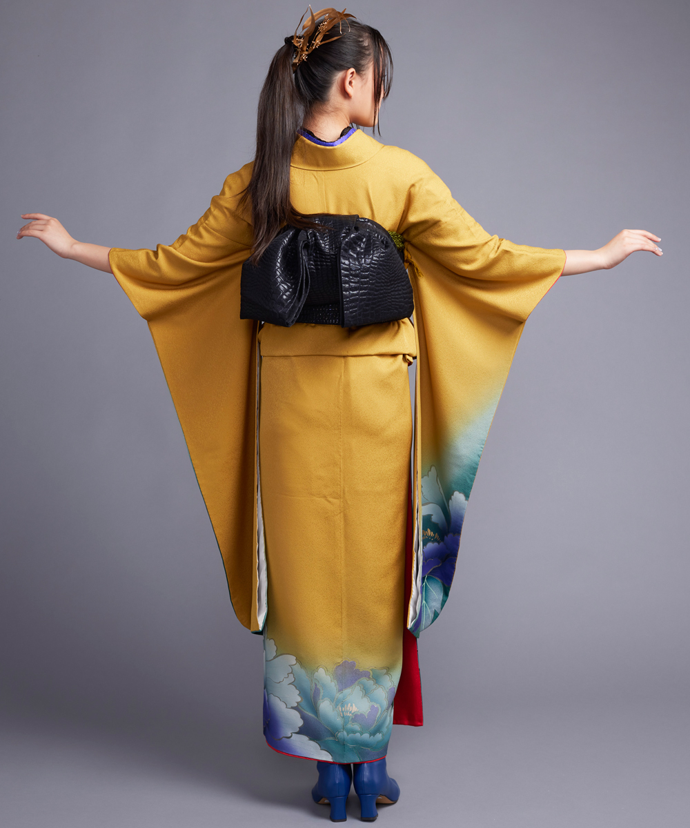 ほっこりこっくりとした、少し渋めのからし色の振袖。裾の花の色と胸元の色を合わせてお顔周りを引き締め、シンプルにかっこよくコーディネート。個性的なセンスの良さを演出できるはず☆。