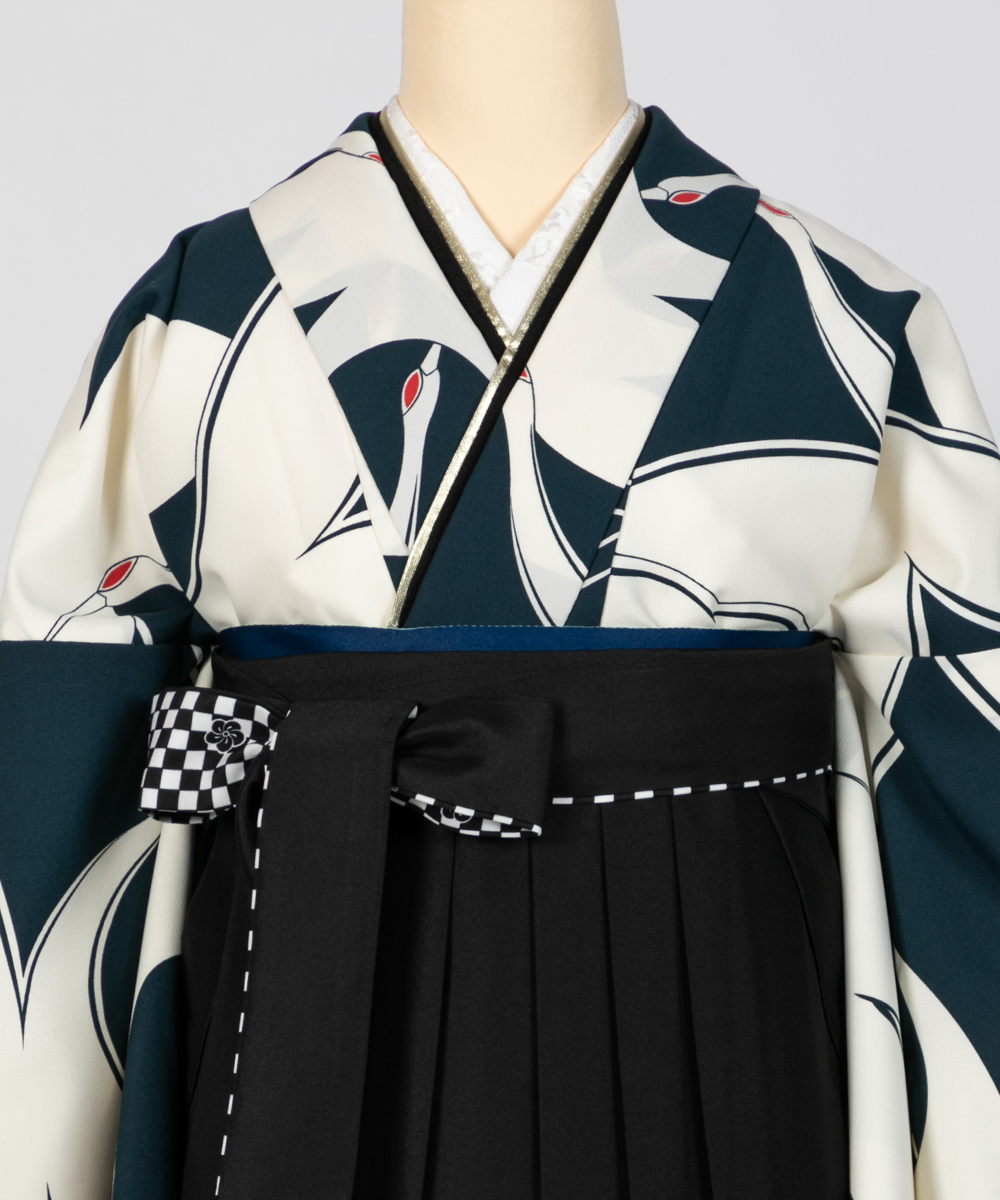 鶴だけが大胆に描かれた紺地の着物。紐の裏に細かい市松柄が描かれた黒袴を合わせることでモダンな雰囲気に☆半襟を白地の刺繡のみで合わせ、重ね襟と半幅帯は黒×金、紺色でまとまりあるコーディネートに仕上げました。