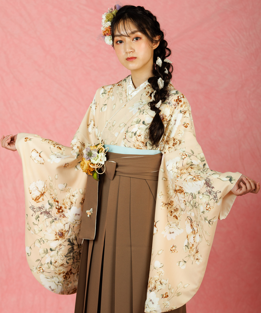 「ドライフラワー」をテーマにデザインされたSUGAR KEIの袴スタイル。ピンクの地色をベースに全体を優しいタッチでまとめた色使いが上品な着物。