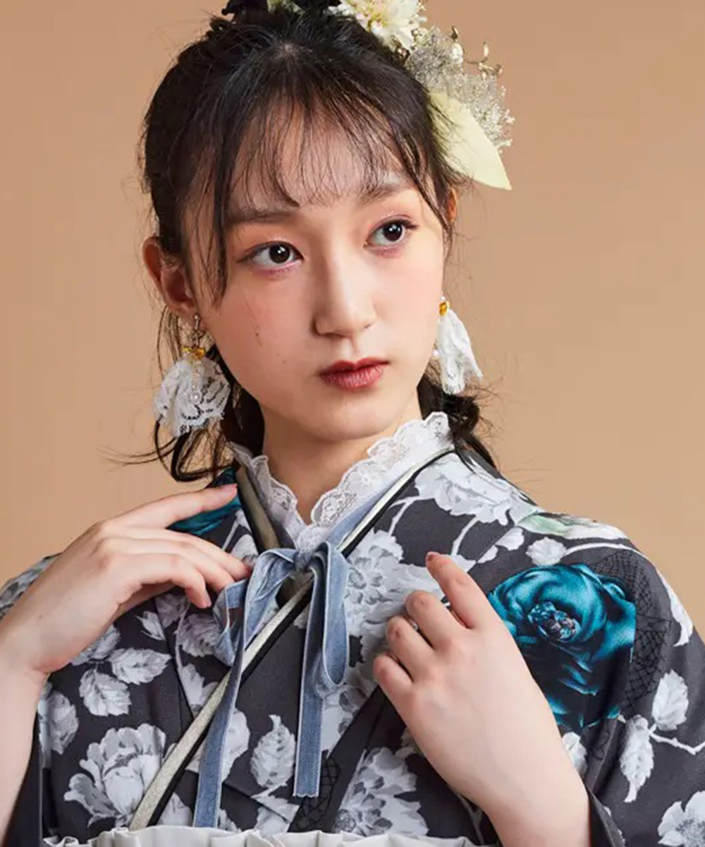 濃いグレーにブルーの薔薇が印象的な着物。同系の黒の袴を合わせてワントーンコーデに☆。