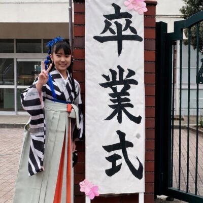 濃赤からだいだい色へのぼかし(グラデーション)の袴。縁起の良い矢羽や梅の花の刺繍があしらわれています。