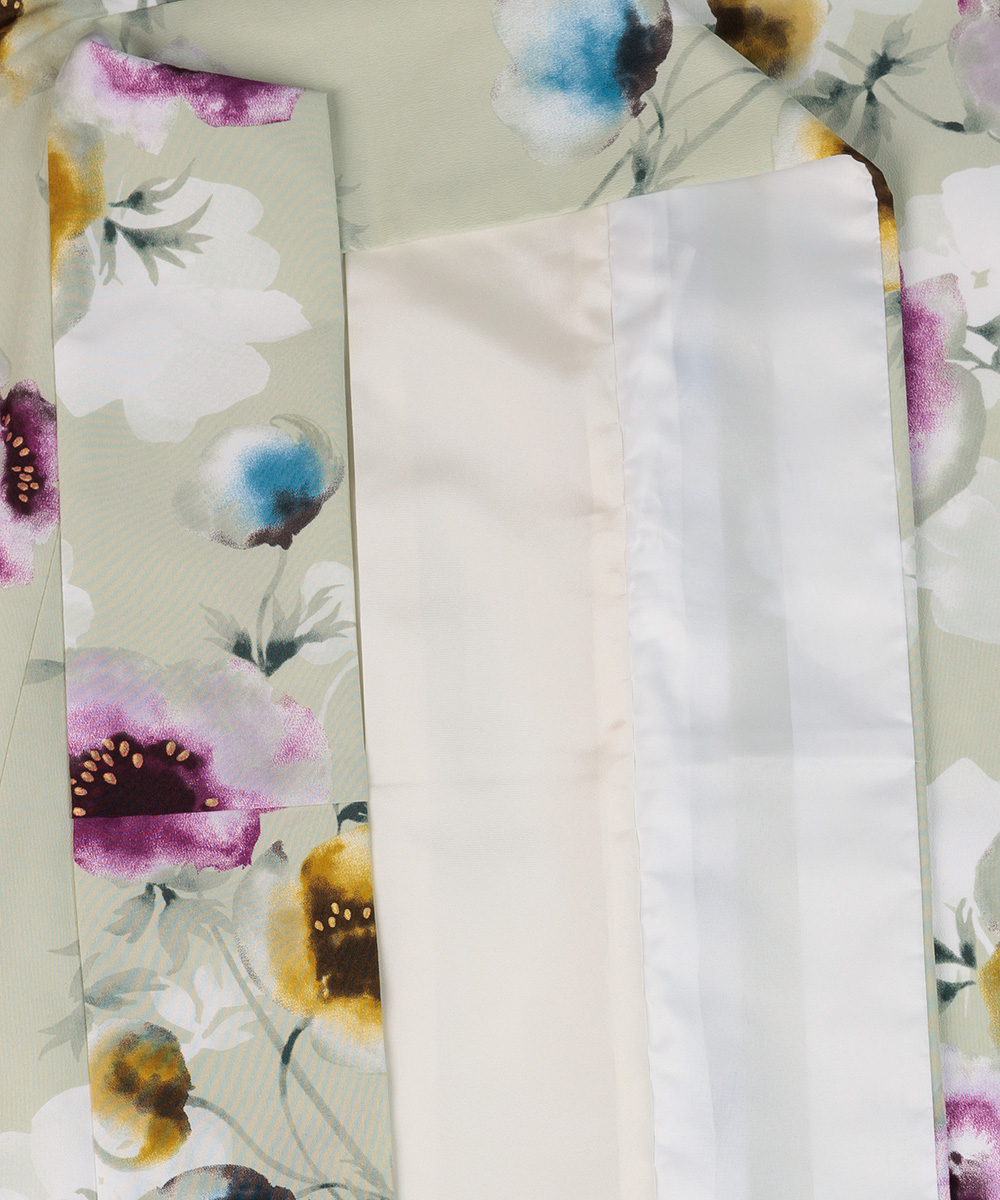 淡い緑地に色とりどりのアネモネ(和名:はないちか)が優しく華やかな雰囲気の着物。白×黄色のアコーディオン袴を合わせて上品な可愛らしさを表現。白レースの半襟や紫の半幅帯でさらに可憐な印象に☆
