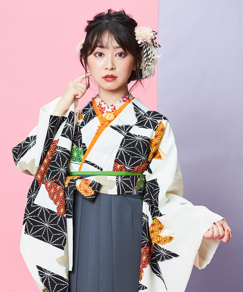 蝶のシルエットや麻の葉の柄が大胆に描かれた着物。鼠色の袴の色目が全体を引き締め、白地の着物と合わせることで凛とした清らかさを表現。後ろ姿が特徴的な人気ブランドJ-ROSSOの袴です☆
