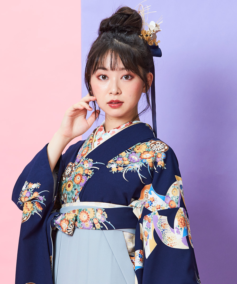 濃紺にひらりと舞い踊る扇面がきらびやかさを演出し、花車が女性らしさをより印象的にしてくれる着物。上品でクールな配色がとても落ち着いた雰囲気を演出。前から見るとアイスグレーの袴なのに後ろ姿は着物と同じ柄。ドレスのようなバックスタイルが特徴的な人気ブランドJ-ROSSOの 袴です。
